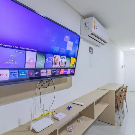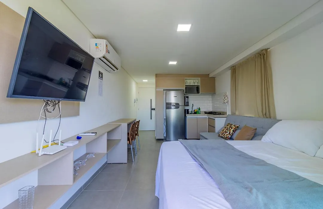 The accommodation has a balcony, a sitting area, and a kitchen, and comforts such as climate control. Villa Del Mar #203- Flat Com Varanda Por Carpediem offers guests the convenient feature of bath sheets in the bathroom.